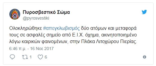 Στην περιοχή Πλάκα στο Λιτόχωρο η Πυροσβεστική χρειάστηκε να επέμβει για να απεγκλωβίσει δύο άτομα που είχαν εγκλωβιστεί στο αυτοκίνητό τους.