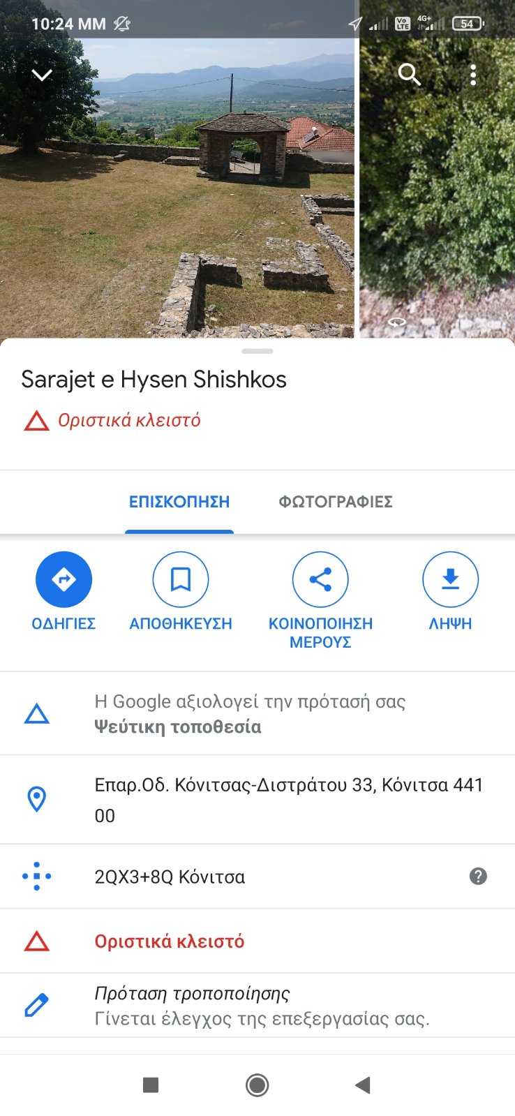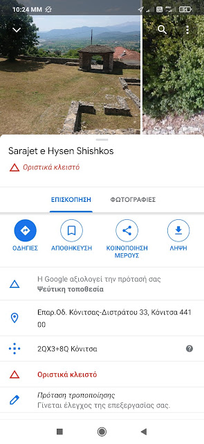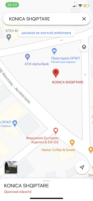 Πληκτρολογείς στην εφαρμογή Google maps για αναζήτηση την λέξη Κόνιτσα. Έπειτα κάνεις μεγέθυνση (zoom) στα δύο συγκεκριμένα σημεία ξεχωριστά (πλατεία Κόνιτσας και σπίτι της Χάμκω). Αφού πατήσουμε το επελεγμένο σημείο που αναφέραμε, ανοίγει η σχετική Επισκόπηση του συγκεκριμένου χώρου. Αν διαβάσουμε προσεκτικά λίγο πιο κάτω, γράφει δίπλα από ένα τριγωνάκι «Οριστικά κλειστό».
