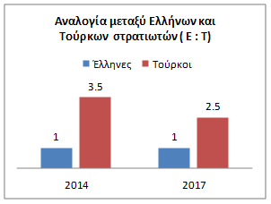 Όσον αφορά τις αναλογίες δυνάμεων Ελλάδας – Τουρκίας παρουσιάζονται σήμερα μειωμένες στο 2,5 Τούρκοι στρατιώτες για κάθε Έλληνα σε σύγκριση με 3,5 : 1 το 2014 και προφανώς έχουν επηρεαστεί από την μείωση της θητείας στους 12 μήνες αλλά και από τις μαζικές εκκαθαρίσεις φερόμενων αντιφρονούντων κατά του καθεστώτος στις Τουρκικές Ένοπλες Δυνάμεις ανάμεσα στις τάξεις των αξιωματικών.