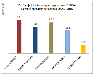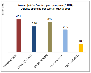 Όσον αφορά την Κατά Κεφαλήν Δαπάνη για την Άμυνα τα δεδομένα το 2016 έχουν ως εξής: