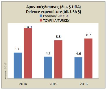 Στην Τουρκία οι δαπάνες για την άμυνα από $10,9 δις που ήταν το 2014 μειώθηκαν στα $8,3 δις το 2015 και έφτασαν τα $8,7 δις το 2016 κυρίως ένεκα των οικονομικών δυσκολιών που η χώρα αντιμετωπίζει τα τελευταία χρόνια.