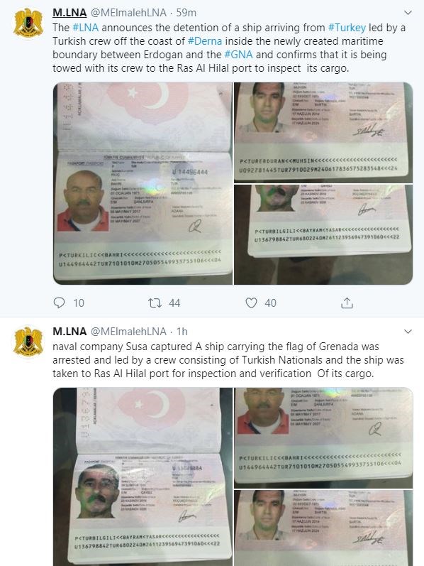 Οι δυνάμεις που στηρίζουν τον Χάφταρ έδωσαν στο πρακτορείο ένα βίντεο που δείχνει να σταματούν το πλοίο και να ανακρίνουν τρία μέλη του πληρώματος. Έδωσαν επίσης στη δημοσιότητα φωτογραφίες με τα διαβατήρια τριών Τούρκων υπηκόων.