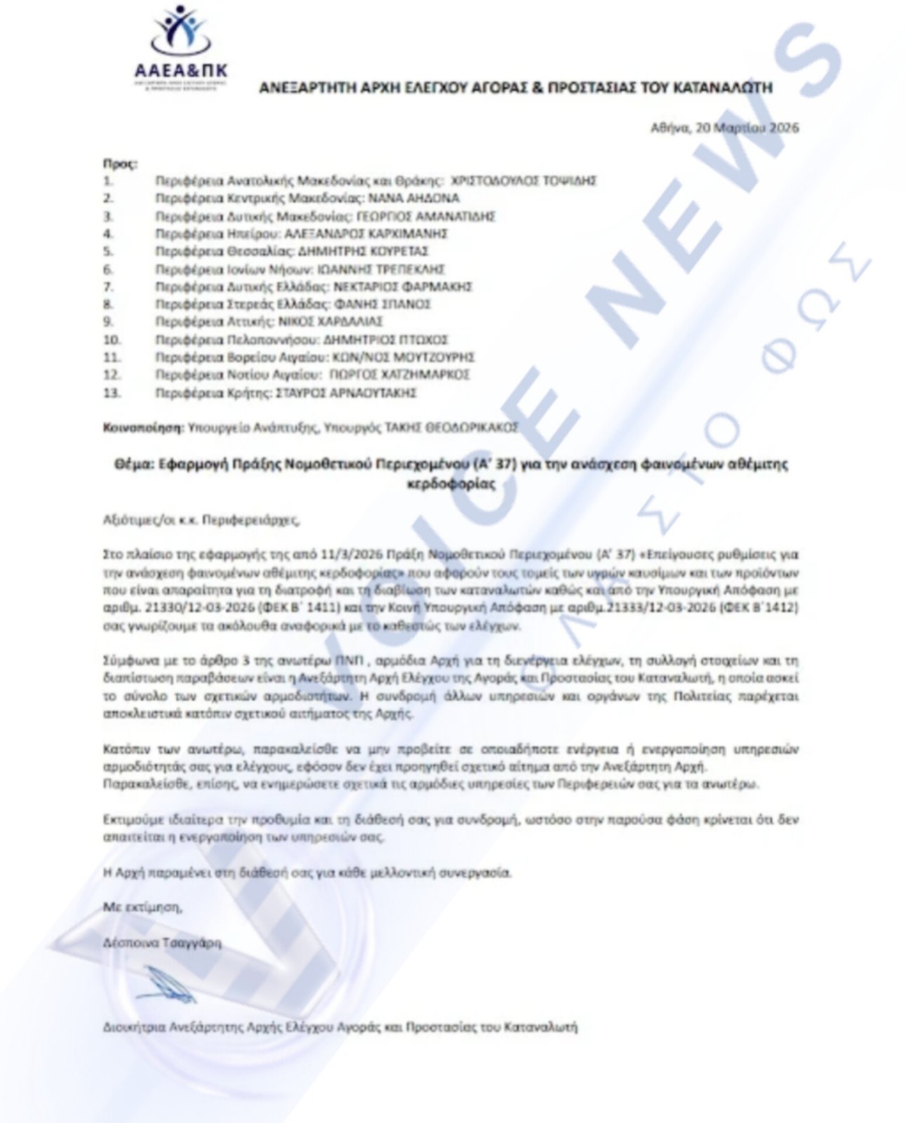 Με την ΠΝΠ της 11ης Μαρτίου 2026 («Επείγουσες ρυθμίσεις για την ανάσχεση φαινομένων αθέμιτης κερδοφορίας», ν. 5289) αποδόθηκε αποκλειστική αρμοδιότητα ελέγχων στην νεοσύστατη Ανεξάρτητη Αρχή Ελέγχου της Αγοράς και Προστασίας του Καταναλωτή. Εννέα μέρες αργότερα, στις 20 Μαρτίου, η Διοικήτρια της Αρχής Δέσποινα Τσαγγάρη απέστειλε στους 13 Περιφερειάρχες (με κοινοποίηση στον υπουργό Ανάπτυξης) έγγραφο με περιεχόμενο: