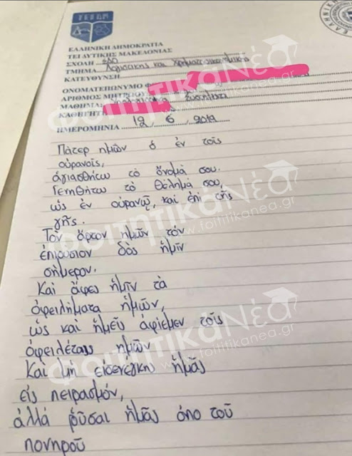Ξέχασε βέβαια το παλληκάρι μία πρόταση – και μάλιστα την σπουδαιότερη – , αλλά μού κάνει φοβερή εντύπωση ότι έγραψε την προσευχή ΣΤΑ ΕΛΛΗΝΙΚΑ !!! ( πολυτονικό , το λένε σήμερα…)