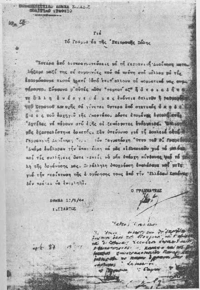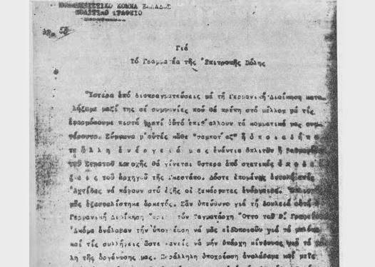«Ύστερα από διαπραγματεύσεις με τη Γερμανική Διοίκηση καταλήξαμε μαζί της σε συμφωνίες που θα πρέπη στο μέλλον να τις εφαρμόσουμε πιστά γιατί αυτό επιβάλλουν τα κομματικά μας συμφέροντα.