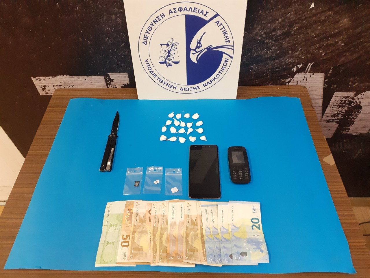 στο κελί του 39χρονου αλλοδαπού, (19) συσκευασίες περιέχουσες κοκαΐνη βάρους -9,7- γραμμαρίων, στιλέτο, το χρηματικό ποσό των (630) ευρώ και (2) συσκευές κινητής τηλεφωνίας