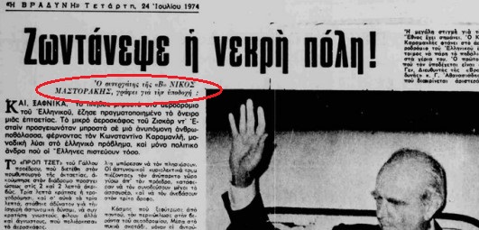 Αυτό ήταν το κακό. Γιατί υπήρχε κι ένα καλό. Η εφημερίδα μπορούσε να κυκλοφορήσει οπιαδήποτε στιγμή. Είχε γραφεία, προσωπικό και δικό της πιεστήριο. Εκείνο βράδυ το έκτακτο φύλλο με τη τεράστια φωτογραφία του Καραμανλή στην πρώτη σελίδα έγινε ανάρπαστο. Ο κόσμος το χρησιμοποιούσε ως αφίσα φωνάζοντας «Έρχεται…»