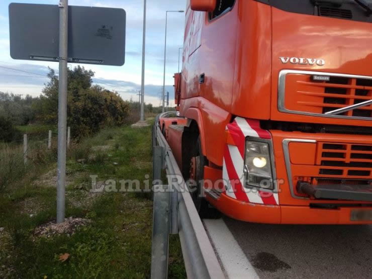 Ένα, επίσης όχι συνηθισμένο, φορτίο ήταν η αιτία για να κλείσει ο δρόμος. Τράκτορας που μετέφερε τσιμεντένια γέφυρα μήκους 40 μέτρων (!) και βάρους 100 τόνων (!), ερχόμενο από Λάρισα και με προορισμό τα έργα του Ε65 στην περιοχή της Φθιώτιδας «σφήνωσε» στην κυριολεξία στις προστατευτικές μπάρες στο σημείο που ανέστρεφε για να πάρει τον παράδρομο για τα έργα.