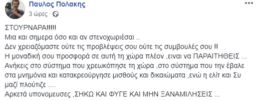 Ειδικότερα, με αφορμή τις κατά καιρούς δηλώσεις του Γιάννη Στουρνάρα για την πορεία της οικονομίας, ο αναπληρωτής υπουργός Υγείας κατηγορεί τον διοικητή της Τράπεζας της Ελλάδα ότι… υπονόμευε (γενικώς) και ότι ανήκει «στο σύστημα που χρεοκόπησε τη χώρα». Έτσι ο Παύλος Πολάκης καλεί τον Γιάννη Στουρνάρα να παραιτηθεί καθώς αύριο η Ελλάδα βγαίνει από τα Μνημόνια και δεν χρειάζεται «ούτε τις προβλέψεις του ούτε τις συμβουλές του !!»