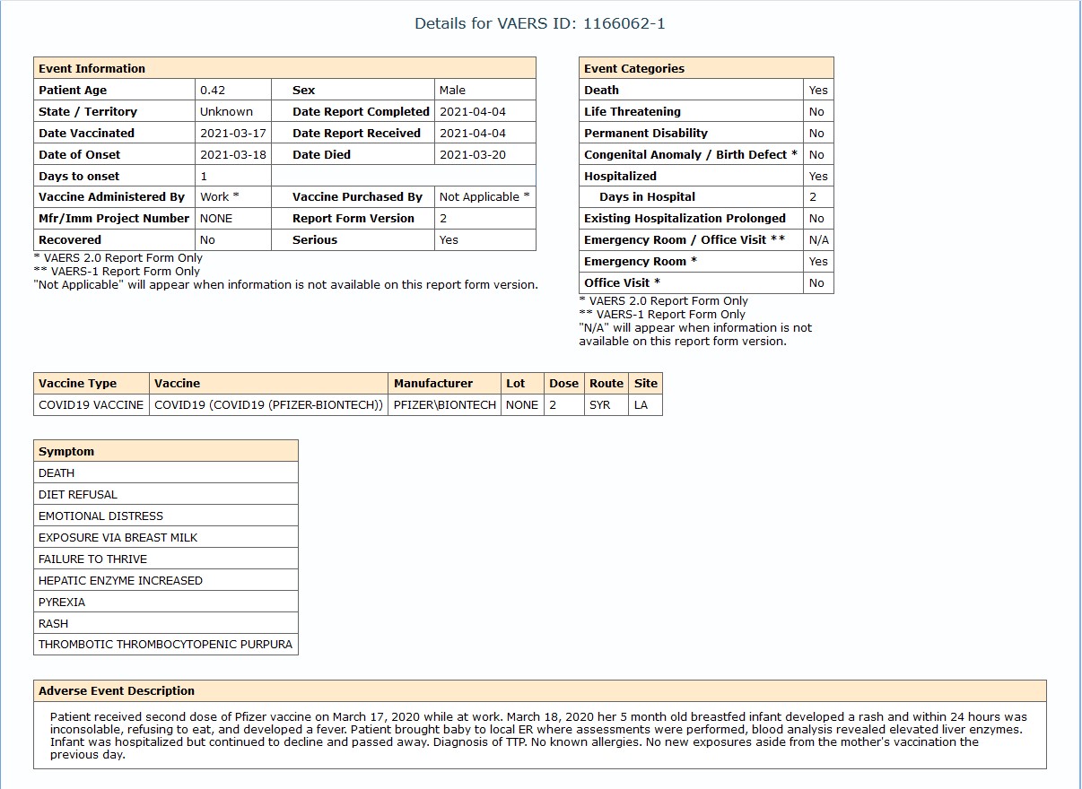 Στις 17 Μαρτίου η μητέρα έλαβε τη δεύτερη δόση του εμβολίου Pfizer/Biontech. Την επόμενη ημέρα, 18 Μαρτίου, το μωρό εμφάνισε εξανθήματα, έκλαιγε απαρηγόρητα, αρνιόταν να φάει και ανέβασε πυρετό. Η μητέρα το πήγε σε νοσοκομείο, σε τμήμα επειγόντων, όπου του έκαναν διάφορες εξετάσεις και διαπίστωσαν αυξημένα ηπατικά ένζυμα. Το μωρό νοσηλεύτηκε για δύο ημέρες, αλλά δεν παρουσίασε βελτίωση και τελικά πέθανε στις 20 Μαρτίου. Διάγνωση: θρομβωτική θρομβοκυτοπενική πορφύρα. Το παιδί δεν είχε εμφανίσει κάποια άλλη αλλεργία και δεν είχε εκτεθεί σε κάτι άλλο, εκτός από το μητρικό γάλα.