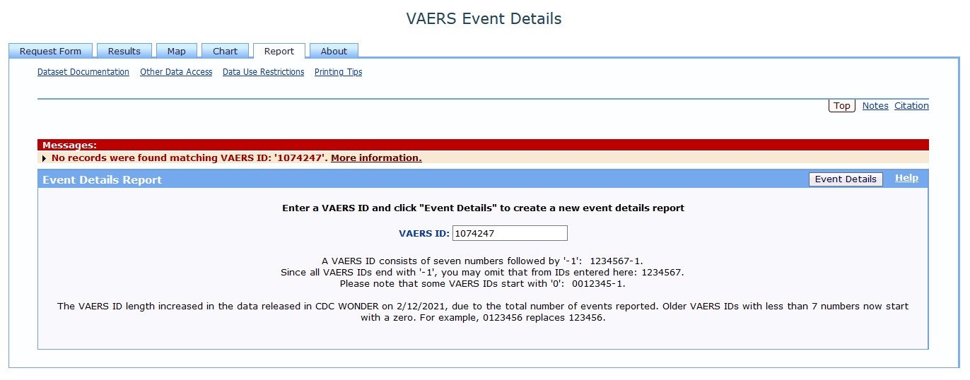 Τώρα λοιπόν που είχαμε το VAERS ID, ξαναπήγαμε στο VAERS, για να βρούμε την αρχική κάρτα, κάνοντας αναζήτηση για τον συγκεκριμένο αριθμό. Αλλά και πάλι, το VAERS επέμενε ότι ο αριθμός αυτός δεν υπάρχει!