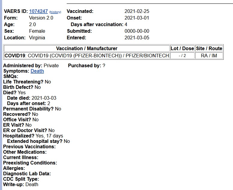 Πρόκειται για την αναφορά θανάτου ενός δίχρονου κοριτσιού στην Πολιτεία Βιρτζίνια των ΗΠΑ, μετά την δεύτερη δόση του εμβολίου COVID της Pfizer/Biontech, στο σύστημα αναφοράς ανεπιθύμητων ενεργειών των εμβολίων των ΗΠΑ (VAERS).