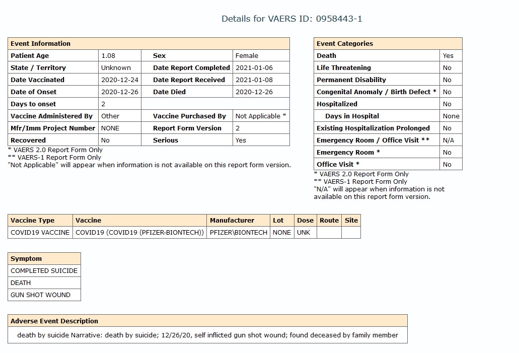 Η άλλη αναφορά θανάτου παιδιού κάτω των 2 ετών στο σύστημα VAERS αφορά στον θάνατο ενός μωρού από αυτοπυροβολισμό!