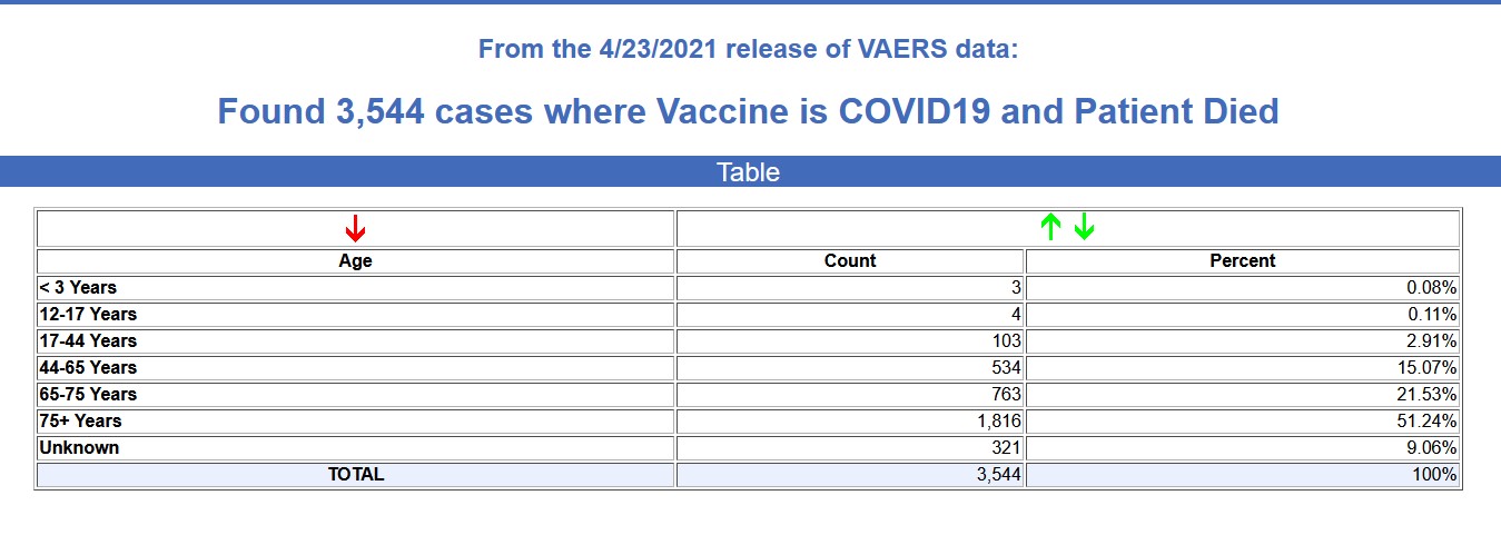 Μια τελευταία επιβεβαίωση, ήταν να ζητήσουμε και από τα δυο συστήματα, VAERS και MedAlerts, μια κατάταξη των θανάτων μετά από εμβόλιο COVID ανά ηλικιακή ομάδα. Τα αποτελέσματα τα βλέπετε στις παρακάτω φωτό.