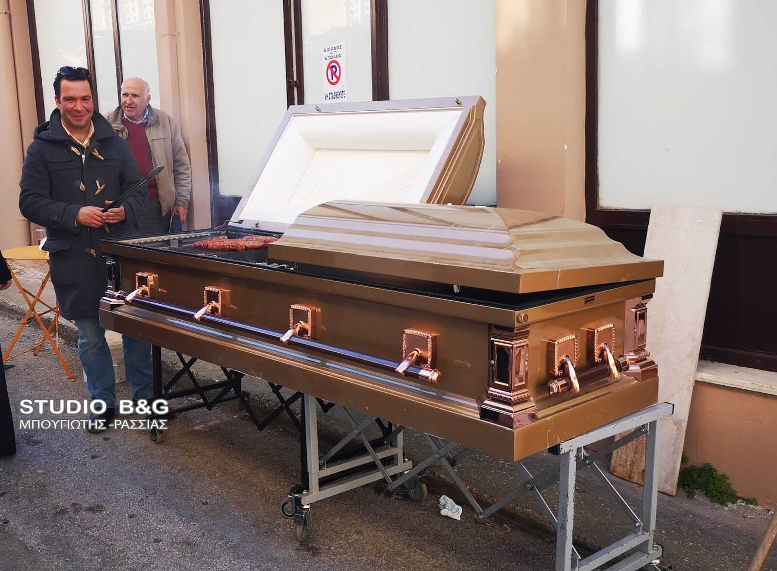 Το γραφείο τελετών του Αλέξανδρου Χρυσικού και του Βασίλη Καραφωτιά στο Ναύπλιο εξέπληξε του πάντες καθώς οι ιδιοκτήτες έφτιαξαν μία ψησταριά… φέρετρο!