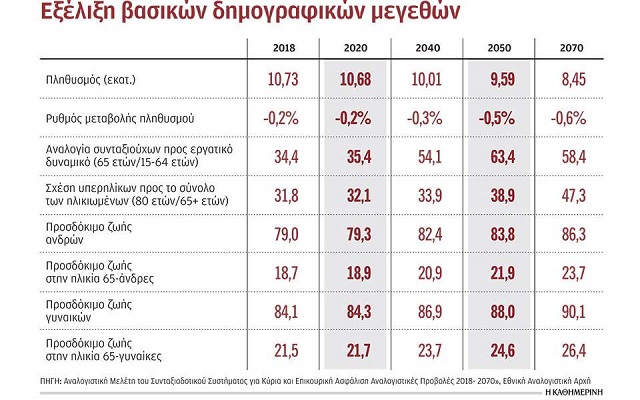 Στην ίδια, πρόσφατη αναλογιστική μελέτη, αναφέρεται ότι ο πληθυσμός της Ελλάδας από 10,729 εκατομμύρια το 2018 μειώνεται σε 8,453 εκατομμύρια το 2070.