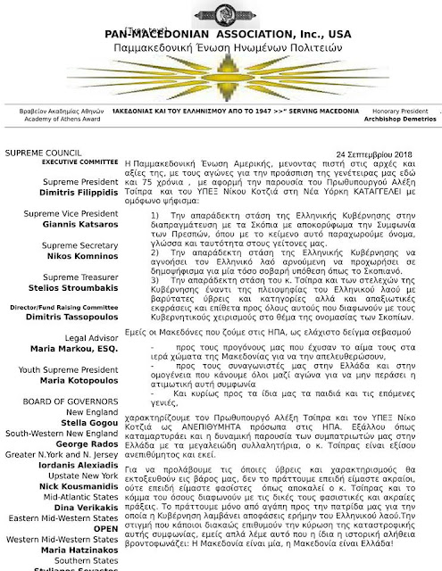 «H ΠΑΜΜΑΚΕΔΟΝΙΚΗ ΗΠΑ με μία ιστορική ομόφωνη απόφαση χαρακτηρίζει τον Ελληνα Πρωθυπουργό Αλέξη Τσίπρα και τον ΥΠΕΞ Νίκο Κοτζιά ΑΝΕΠΙΘΥΜΗΤΟΥΣ στις ΗΠΑ!» σημειώνει σε ανάρτησή του ο πρόεδρος, Δημήτρης Φιλιππίδης επισυνάπτοντας το σχετικό έγγραφο: