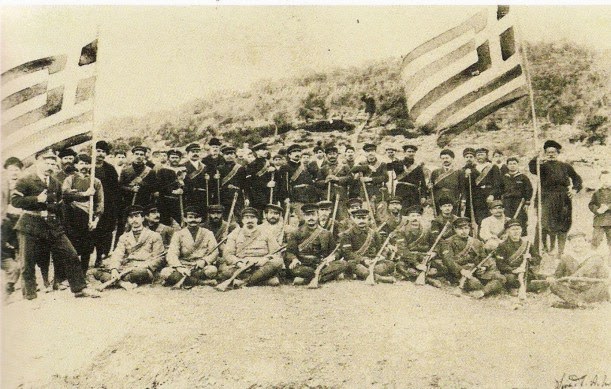 Οι κώδωνες των εκκλησιών ήχουν χαρμοσύνως, ενώ αι νέαι με άνθη εις τας χείρας έραινον τους ευσταλείς νέους της Φάλαγγος, η δε μουσική ορχήστρα η διευθυνομένη παρά του γνωστού μουσικού κ. Εμμανουήλ Χατζέλη επαιάνιζε εναλλάξ τον εθνικόν ύμνον και το «μαύρη είναι η νύχτα στα βουνά»…