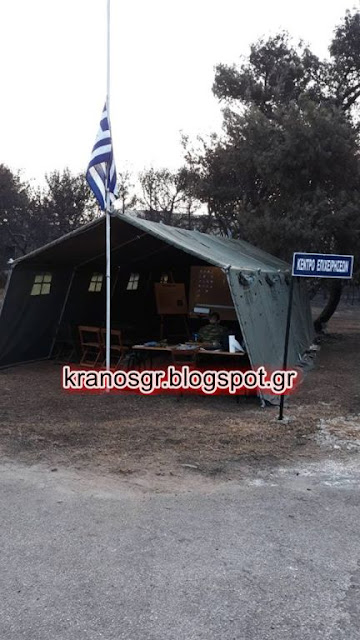 Επίσης στην περιοχή Μάτι, με μεσίστια την Ελληνική Σημαία λόγω του τριήμερου εθνικού πένθους, λειτουργεί και κέντρο επιχειρήσεων του Στρατού Ξηράς, στο οποίο μπορούν να απευθύνονται όλοι οι κάτοικοι της περιοχής.