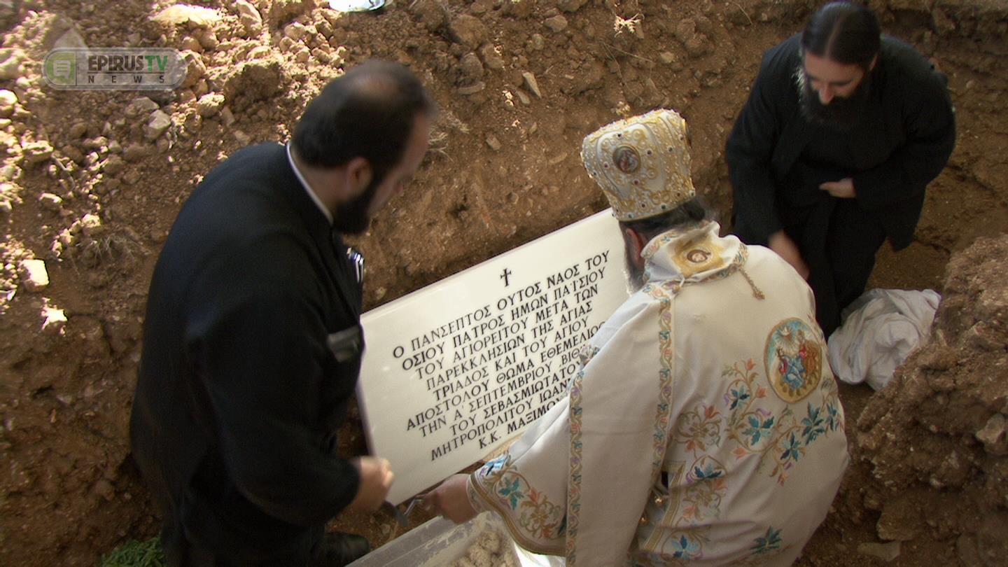 Μετά τον Όρθρο και την Αρχιερατική Θεία Λειτουργία ο σεβασμιότατος Μητροπολίτης Ιωαννίνων Μάξιμος τέλεσε τον αγιασμό , τοποθέτησε τον πρώτο θεμέλιο λίθο και αποκάλυψε τη μαρμάρινη επιγραφή με στοιχεία που αφορούν στη θεμελίωση του Ιερού Ναού του Οσίου Παϊσίου του Αγιορείτου .