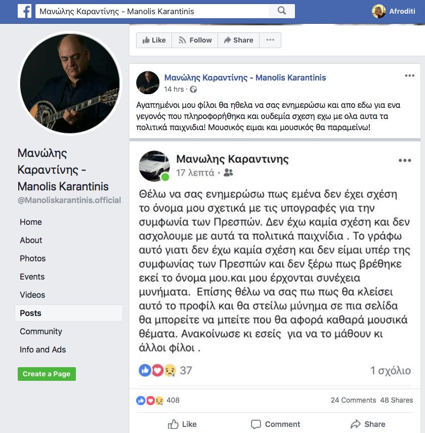 Ο γνωστός καλλιτέχνης ανέφερε συγκεκριμένα: «Δεν ασχολούμαι με την πολιτική αλλά με τη μουσική. Δεν έχω ασχοληθεί ποτέ με τη Συμφωνία των Πρεσπων. Κάποιος έβαλε το όνομά μου χωρίς να έχω δώσει καμία έγκριση».