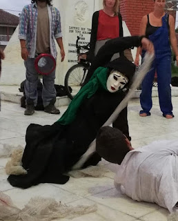 Εικόνες ντροπής αντικρίσαμε το απόγευμα του Σαββάτου κατά την διάρκεια παράστασης από Γάλλους και ανθρώπους άλλων εθνικοτήτων στο Χέρσο του νομού Κιλκίς. Όπως μπορείτε να διακρίνετε στις φωτογραφίες άντρες και γυναίκες ντυμένοι με κουρέλια και ένας εξ αυτών με μαύρο μανδύα καθώς και φορώντας μάσκες δίνουν την παράσταση τους μπροστά από το μνημείο των Ηρώων. Αν παρατηρήσετε λίγο καλύτερα στις φωτογραφίες θα δείτε πάνω στο μνημείο αφημένο ποδήλατο, τσάντες και μια μάσκα στην κορυφή του. Και σαν δεν έφταναν όλα αυτά, στον υπερυψωμένο χώρο του μνημείου ανέβασαν και δύο άλογα.