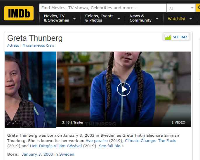 Το καλύτερο σας το αφήσαμε για το τέλος. Η 16χρονη που κανονικά έπρεπε να ήταν στο σχολείο της και να διαβάζει τα μαθήματά της από το να προβάλλει λάθος πρότυπα μέσω της ακτιβιστικής της δράσης, έχει καταχωρηθεί στο IMDb, τη δημοφιλέστερη βάση δεδομένων για ταινίες και σειρές, ως ηθοποιός έχοντας συμμετάσχει μέχρι στιγμής σε τρεις δουλειές, το Ave paraíso (2019), Climate Change: The Facts (2019) και Heti Dörgés Villám Gézával (2019). Σημειωτέον, ότι ο πατέρας της Σβάντε Τούμπεργκ είναι ηθοποιός, ενώ ο παππούς της, Όλοφ, είναι γνωστός σκηνοθέτης. Συνεπώς τα γονίδια μιλούν από μόνα τους…