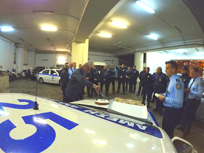 Αμέσως μετά την έλευση του νέου έτους, η βασιλόπιτα κόπηκε για όλους τους αστυνομικούς της νυχτερινής βάρδιας πάνω σε περιπολικό.