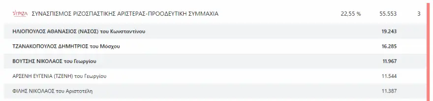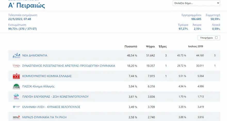Συγκεκριμένα, sτην Α’ Αθηνών η ΝΕΑ ΔΗΜΟΚΡΑΤΙΑ, συγκεντρώνει ποσοστό 42,18% και εκλέγει 7 βουλευτές. Ο ΣΥΡΙΖΑ 22,55% και εκλέγει 3 βουλευτές. Το ΚΚΕ 8,59% και εκλέγει 1 βουλευτή, το ΠΑΣΟΚ 6,71 % και εκλέγει 1 βουλευτή και τέλος η ΕΛΛΗΝΙΚΗ ΛΥΣΗ 3,03% και 1 βουλευτή.