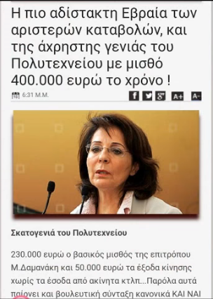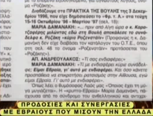 1. Αυτοί πού πρότειναν τήν Δαμανάκη για πρόεδρο τής Ελλάδας, είναι αυτοί πού τήν κατασκεύασαν όπως καί τόν Τσίπρα, η ιουδαϊκή οικονομική ελίτ πού θεωρούν τήν Ελλάδα χρεοδουλοπαροικια τούς με τά απατηλά μνημόνια τούς. Όποιος πολιτικός συμφωνεί με τους Ιουδαίους είναι υπάλληλος τούς καί δεν έχει θέση στην βουλή.