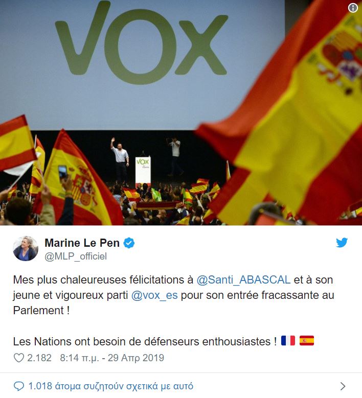 «Τα πιο θερμά μου συγχαρητήρια στον Σαντιάγο Αμπασκάλ και στο Vox για την θριαμβευτική του είσοδο στην ισπανική Βουλή. Τα έθνη έχουν στρατούς από ενθουσιώδεις υπερασπιστές».