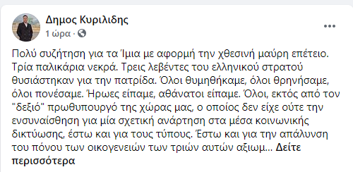 «Πολύ συζήτηση για τα Ίμια με αφορμή την χθεσινή μαύρη επέτειο. Τρία παλικάρια νεκρά. Τρεις λεβέντες του ελληνικού στρατού θυσιάστηκαν για την πατρίδα. Όλοι θυμηθήκαμε, όλοι θρηνήσαμε, όλοι πονέσαμε. Ήρωες είπαμε, αθάνατοι είπαμε. Όλοι, εκτός από τον «δεξιό» πρωθυπουργό της χώρας μας, ο οποίος δεν είχε ούτε την ενσυναίσθηση για μία σχετική ανάρτηση στα μέσα κοινωνικής δικτύωσης, έστω και για τους τύπους. Έστω και για την απάλυνση του πόνου των οικογενειών των τριών αυτών αξιωματικών. Βέβαια δεν πρέπει να έχουμε παράπονο όλοι εμείς οι εθνικά σκεπτόμενοι πολίτες, μιας και το καθήκον του έναντι της ελληνικής ιστορίας το τήρησε τον περασμένο Νοέμβριο καταθέτοντας στεφάνι στην κεφάλα της Ηλένιας με αφορμή την «επέτειο» του ψευδο πολυτεχνείου. Επίσης επέτρεψε εν μέσω καραντίνας να πραγματοποιηθούν οι πορείες και οι εκδηλώσεις προς τιμήν της ημέρας εκείνης. Μην έχετε παράπονο πατριώτες που ξεχνάμε τους ήρωες των Ιμίων. Τιμούμε κάθε χρόνο ανελλιπώς τον Σβορώνο, την Ηλένια, τον λύκο, την Κοκκινοσκουφίτσα, τον παπουτσομένο γάτο, την Χιονάτη και τους εφτά νάνους!»