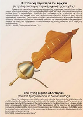 «Κάπου γύρω από το έτος 400 π.Χ., ο Αρχύτας σχεδίασε  και διασκεύασε  για τους πολίτες του Τάραντα ένα ιπτάμενο περιστέρι από ξύλο», μας ενημερώνει για το („Brief history of rockets“.)   » Σύντομο ιστορικό των ρουκετών » της NASA . Η υιοθέτηση του Kirchers περί  του περιστεριού του Αρχύτα  ήταν ότι χρησιμοποίησε το μαγνητισμό ως δύναμη για τεχνητές κινήσεις στον αέρα.[ZB Magnet 3] Athanasius Kircher (1601-1680), Magnes sive De arte magnetica tripartium ( Köln: Iodocus Kalcoven, 1643), Zentralbibliothek Zürich, Alte Drucke und Rara, Z 113, fol. 315