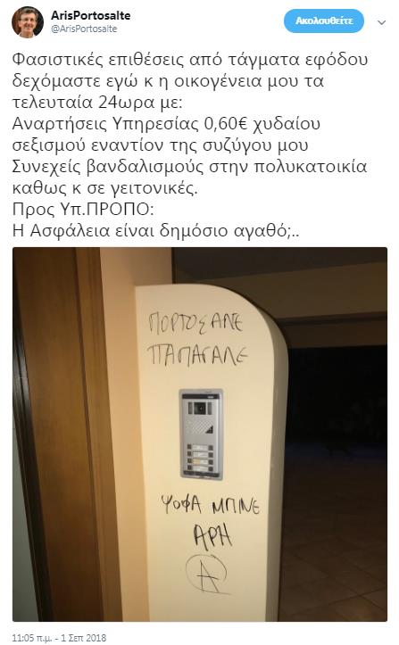 Σε ανάρτησή του μάλιστα στο twitter αναφέρει ότι «Φασιστικές επιθέσεις από τάγματα εφόδου δεχόμαστε εγώ κ η οικογένεια μου τα τελευταία 24ωρα με: Αναρτήσεις Υπηρεσίας 0,60€ χυδαίου σεξισμού εναντίον της συζύγου μου Συνεχείς βανδαλισμούς στην πολυκατοικία καθώς κ σε γειτονικές. Προς Υπ.ΠΡΟΠΟ: Η Ασφάλεια είναι δημόσιο αγαθό;..»