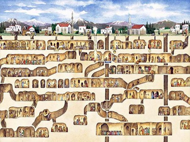 Η υπόγεια πόλη Derinkuyu ανακαλύφθηκε για πρώτη φορά κάτω από αυτό το σπίτι. Από τότε, 8 επίπεδα από όλο το συγκρότημα έχουν ξεθαφτεί. Τα ανώτερα επίπεδα είναι κυρίως κατοικημένοι χώροι, αλλά κάθε πόλη προσφέρει περισσότερα από αυτό: ένα πατητήρι κρασιού, ένα μοναστήρι και μία εκκλησία βρέθηκαν επίσης.