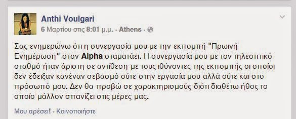Η Ανθή Βούλγαρη όμως δεν ανήκει πλέον στο δυναμικό του καναλιού και έρχεται να προστεθεί στη λίστα των απολύσεων που -δυστυχώς- αναμένεται όπως όλα δείχνουν να συνεχιστούν στο χώρο των ΜΜΕ.