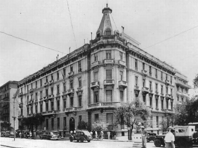 Από τα πρώτα τέτοια κτίρια μεγάλης κλίμακας στην πόλη και με χαρακτηριστικό τον πυργοειδή τρούλο στη γωνία του, «τεμαχίστηκε» κατά τη δεκαετία του 1960 και στο γωνιακό του τμήμα, που κατεδαφίστηκε, χτίστηκε κτίριο γραφείων. Το άλλο τμήμα, που κατά την κατοχή στέγασε τη γερμανική πρεσβεία (φωτ.) διατηρείται μέχρι σήμερα.