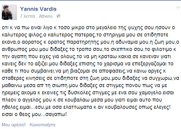 Αυτό είναι το συγκινητικό αποχαιρετιστήριο μήνυμα του Γιάννη Βαρδή, γιου του μεγάλου μουσικοσυνθέτη Αντώνη Βαρδή, που… έχασε τη μάχη με τον καρκίνο τα ξημερώματα της Τρίτης, σε ηλικία 66 ετών: «Ότι και να πω είναι λίγο και τόσο μικρό στο μεγαλείο της ψυχής σου. Ήσουν ο καλύτερος φίλος, ο καλύτερος πατέρας, το στήριγμά μου σε οτιδήποτε έκανα, ο αόρατος και ορατός παρατηρητής μου, η αδυναμία μου, η ζωή μου και ο άνθρωπός μου. Μου δίδαξες τον τρόπο σου, το σκεπτικό σου, το φιλότιμο και την αγάπη που είχες για όλους και το να μην κρατάω κακία σε κανέναν γιατί κανείς δεν το αξίζει.