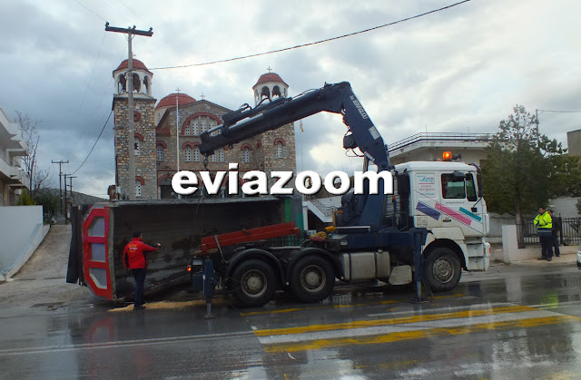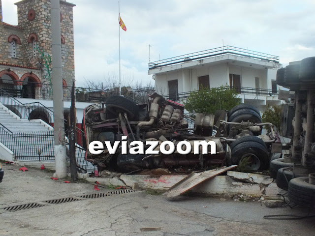Ο 46χρονος οδηγός της νταλίκας που βλέπετε, έχασε τον έλεγχό της από άγνωστη αιτία, με αποτέλεσμα το βαρύ όχημα να εκτραπεί της πορείας του, να ανατραπεί και να συρθεί με σφοδρότητα στο προαύλιο του Ιερού Ναού των Ευβοέων Αγίων.