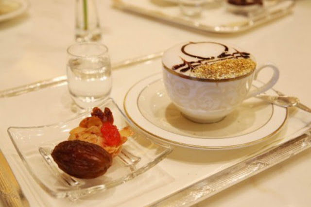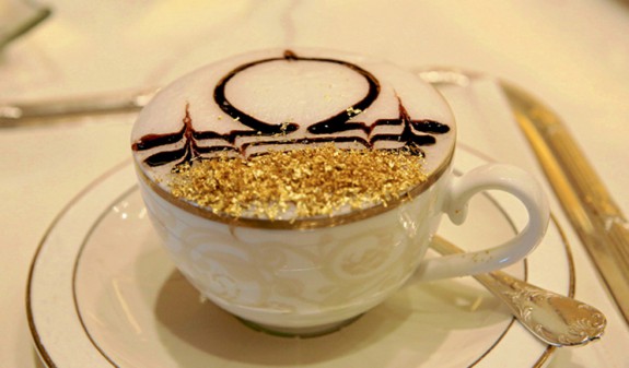 Ο χρυσός πάνω στο αφρόγαλα κερδίζει τις εντυπώσεις αλλά και το σερβίρισμα δεν πάει πίσω, αφού έρχεται το φλιτζάνι πάνω σε ασημένι δίσκο με τα απαραίτητα συνοδευτικά. Το εν λόγω ξενοδοχείο έχει αδυναμία στον χρυσό, ώστε εκτός από τον καπουτσίνο τον βάζουν και στα burgers, ενλω ετοιμάζονται να δημιουργήσουν και μια σειρά επιδορπίων με φύλλα χρυσού…