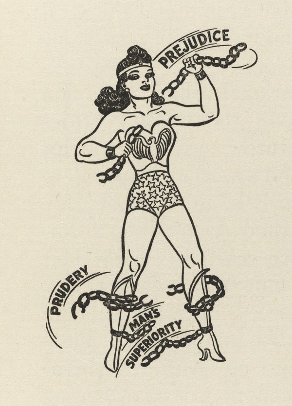 Έτσι, σχεδόν σε κάθε επεισόδιο των πρώτων κόμικς, εκείνων που έγραψε ο Marston [ο Marston σταμάτησε να γράφει την Wonder Woman το 1947], την βλέπουμε δεμένη με αλυσίδες ή σχοινιά από τα οποία πρέπει να ξεφύγει. Αυτό, κατά τον Marston «σημάνει την χειραφέτηση από τους άνδρες». Αλλά αυτές οι αλυσίδες είναι ένα πολύ σημαντικό μέρος των αγώνων των φεμινιστιριών και των σουφραζέτων της δεκαετίας του 1910 τις οποίες υποστήριζε ο Marston. Φεμινισμός, σαδομαζοχισμός, σιωνισμός, αντισημιτισμός και Wonder Woman (ναι, όλα αυτά) - Εικόνα6