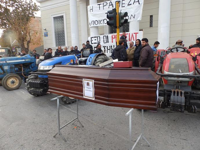Οι συγκεντρωμένοι έχουν παρατάξει αγροτικά οχήματα έξω από το κτίριο της τράπεζας, ενώ στην πρόσοψη του κτιρίου, όπου βρίσκεται και η κεντρική είσοδος, έχουν υψώσει δύο πανό κι ένα φέρετρο, πάνω στο οποίο υπάρχει ένα κηδειόχαρτο της Άνγκελα Μέρκελ.
