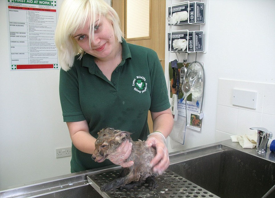 Θα μπορούσε να είναι πολύ αργά για το πλασματάκι λόγω ασφυξίας ή υποθερμίας. Ωστόσο, το ζώο που έμοιαζε με κουτάβι μεταφέρθηκε γρήγορα στο Νοσοκομείο άγριων ζώων του Νότιου Έσσεξ όπου το έπλυναν.