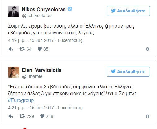 Ο Νίκος Χρυσολωράς (επικεφαλής του γραφείου του Bloomberg στις Βρυξέλλες) και η ανταποκρίτρια της Καθημερινής στη βελγική πρωτεύουσα, Ελένη Βαρβιτσιώτη, τουίταραν: