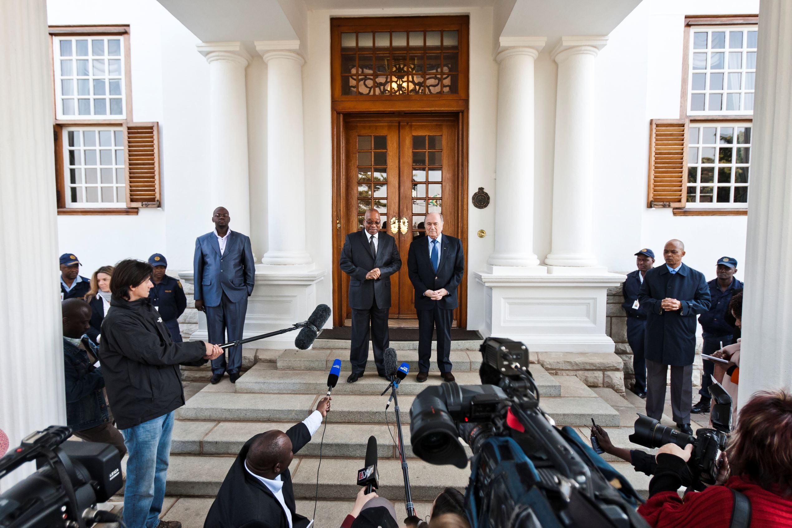 (Φωτο): Ο πρόεδρος της FIFA Sepp Blatter (δεξιά) με τον Πρόεδρο της Νότιας Αφρικής Jacob Zuma στην επίσημη κατοικία του, Mahlamba Ndlopfu.