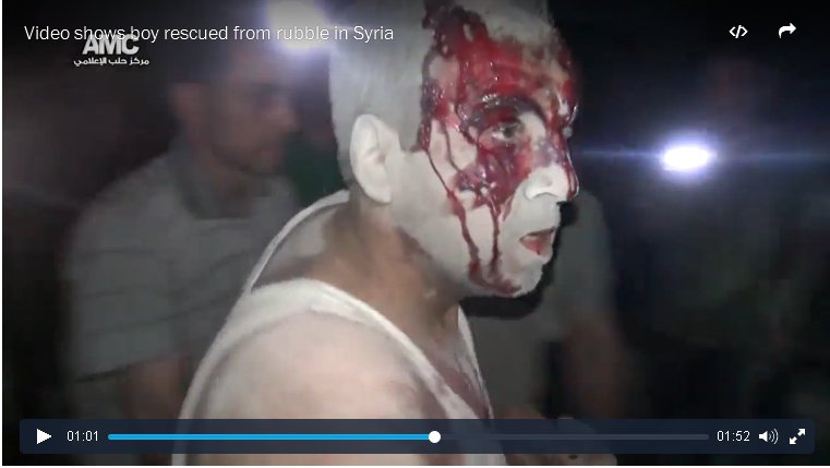 Μας ενημερώνει η ναυαρχίδα της δημοσιογραφίας «Αυγή» και ακριβώς τα ίδια λόγια επαναλαμβάνουν ΟΛΑ τα ΜΜΕ κι ΟΛΟΙ οι δημοσιογράφοι: «Όλη η φρίκη του πολέμου της Συρίας αποτυπωμένη στην εικόνα του πεντάχρονου Ομράν Ντακνίς στο πίσω μέρος ενός ασθενοφόρου. Σοκαριστική η εικόνα του μικρού παιδιού, το οποίο διεσώθη μετά από αεροπορική επιδρομή στο Χαλέπι… Από το κεφάλι ως τα δάχτυλα είναι καλυμμένο μέσα σε σκόνη, ζαλισμένο, φαίνεται ότι δεν αντιλαμβάνεται την ανοικτή πληγή στο μέτωπό του, ούτε τον παραλογισμό της βίας που τον περιβάλλει…».