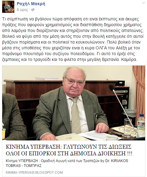 Γι αυτό βρε διώκετε όλους όσους δεν διορίστηκαν με βύσμα και νομοθετείτε όλη μέρα για τα διορισμένα πράσινα γαλάζια και ροζ παιδιά; Για αυτό όλα τα λαμόγια στο δημόσιο σας στηρίζουν σαν σκυλιά; Για πες μας κυρία μου υπάρχει πόρισμα του Ρακιτζή για τον συζύγο σου πολεοδόμο για παράνομο πλουτισμό και χρηματισμό ναι ή οχι;