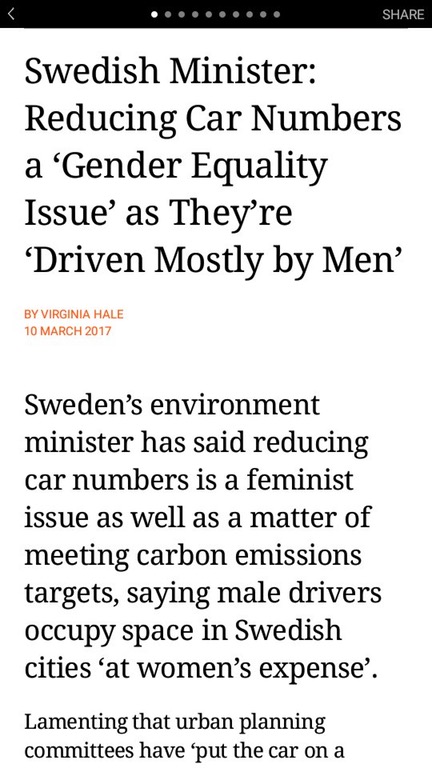 «Τα αυτοκίνητα τα οδηγούν σε μεγάλο βαθμό άνδρες, και έτσι δίνεται πολύς χώρος στα αυτοκίνητα. Δίνουμε πολύ χώρο στους άνδρες – εις βάρος των γυναικών», εξήγησε. – Αυτό γιατί μου ακούγεται «σεξιστικό»;