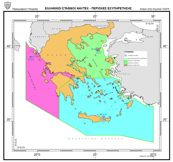 Οι Ελληνικές θάλασσες εξυπηρετούνται με μηνύματα NAVTEX που εκδίδονται στην Αγγλική και Ελληνική γλώσσα (Διεθνή και Εθνική Υπηρεσία NAVTEX) και εκπέμπονται από τρείς (3) Ελληνικούς Σταθμούς εγκαταστημένους στο ΗΡΑΚΛΕΙΟ (35° 19´ 19,7´´ – 25° 44´ 54,9´´) με χαρακτηριστικό [Η],[Q],[S] αντίστοιχα για το Νότιο Αιγαίο, στη ΚΕΡΚΥΡΑ (39° 36´ 25,7´´ – 19° 53´ 28,4´´) με χαρακτηριστικό [Κ],[Ρ] αντίστοιχα για το Ιόνιο Πέλαγος και ΛΗΜΝΟ (39° 54´ 24,7´´ – 25° 10´ 50,7´´) με χαρακτηριστικό [L],[R] αντίστοιχα για το Αιγαίο. Η περιοχή εξυπηρετήσεως του κάθε σταθμού καθώς και τα όριά του απεικονίζονται στο χάρτη με τίτλο «ΕΛΛΗΝΙΚΟΙ ΣΤΑΘΜΟΙ NAVTEX – ΠΕΡΙΟΧΕΣ ΕΞΥΠΗΡΕΤΗΣΗΣ».