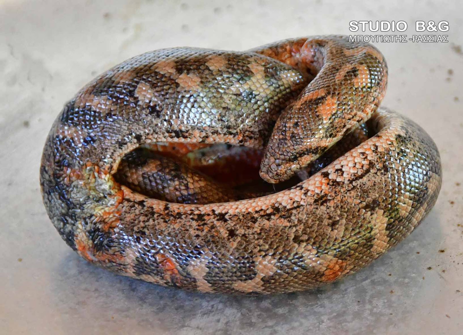 Το φίδι ήταν τραυματισμένο στο κάτω μέρος του σώματος του . Αφού του παρασχέθηκαν οι πρώτες βοήθειες από τον αγρότη, το άφησε ελεύθερο και πάλι στο φυσικό του περιβάλλον.